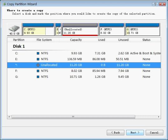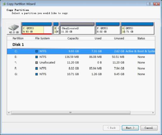 In this interface, select the partition needing backing up (system partition), and then click "Next" button:
