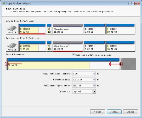 In this interface, we should drag the whole partition handle to change location of partition. In addition, we can drag the border of partition handle to resize partition. After all settings, click "Finish" button.