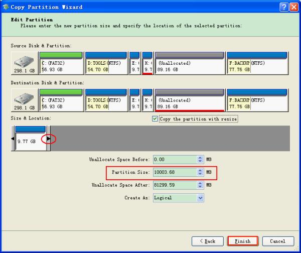 Here are the partition to copy and the storage space. You can also drag the border of partition handle or directly enter exact value in corresponding textbox to resize partition. After that, click "Finish".