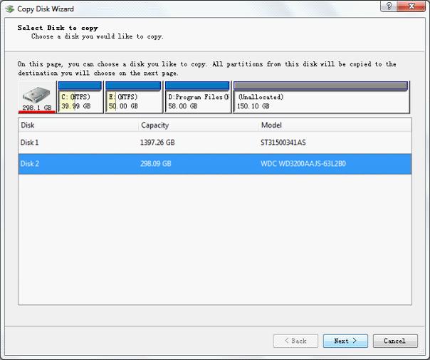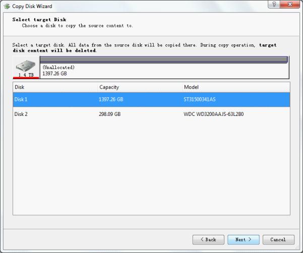 Select a disk to copy the source content and click "Next >" to enter the next interface: