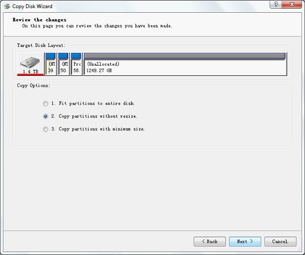This drive copy software provides users with 3 different backup modes, namely "Fit partition to entire disk", "Copy partition without resize" and "Copy partition with minimum size". The first one means to expand the backup partition till occupying the whole disk according to certain proportion. The second one is to back up partition according to original partition state, bringing no influence on partition size. The third one is to shrink partitions on backup disk to the size which is the same as data occupy. Here, we select the second mode and click "Next >" to perform next operation:
