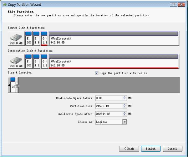 Here, you can resize the cloned partition by dragging the partition handle border or directly entering exact value. Then, click "Finish" to fundamentally clone partition.