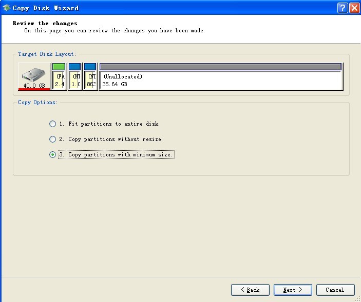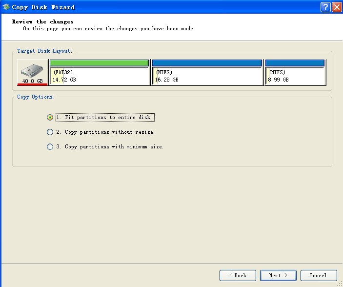 There are 3 ways to clone. Option1 is clone to fill disk 4. Option2 is clone disk1 as it was. Shown as below: