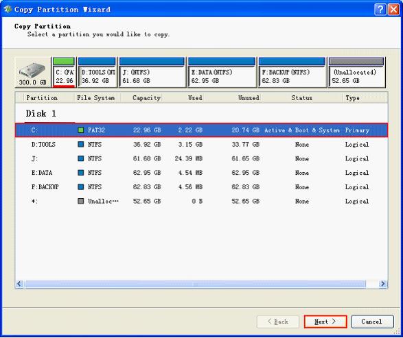 Here, you can see all existing hard drivers. Choose the hard driver to copy and click "Next >".