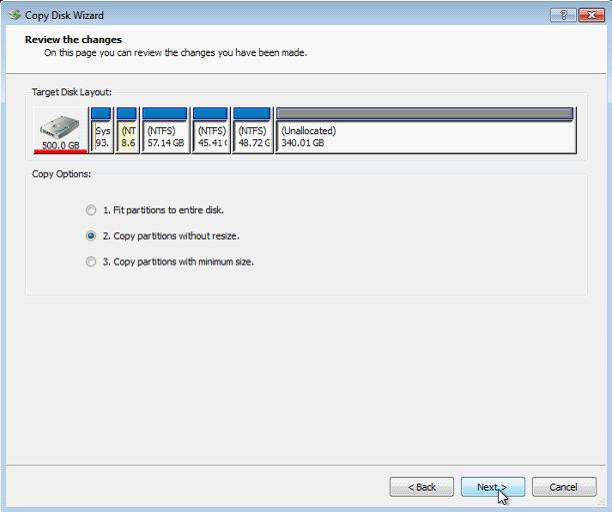 Step 4, set size for cloned disk partitions. To copy partition without resizing, you should choose the second option and click "Next >".