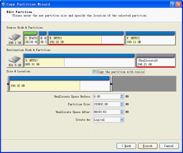 Here, we can set partition location and partition size. Then, click "Finish" button to end clone. Now, we are successful to clone a hard drive with professional hard drive copy software.