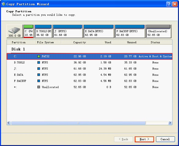 Then, select the system partition which needs backing up and click "Next" to enter the next interface: