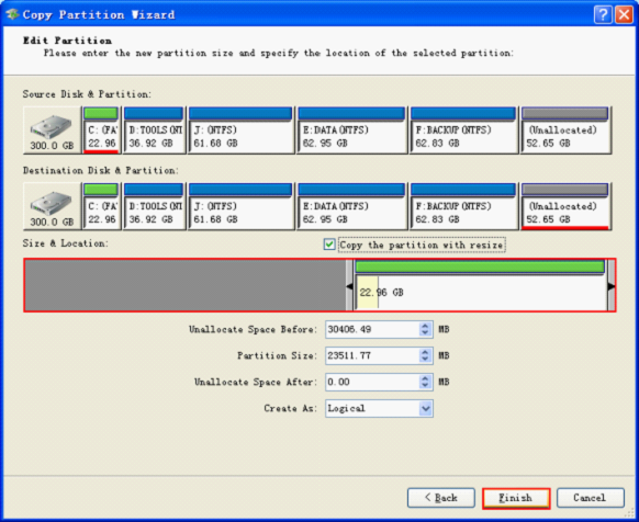 In the above interface, we can resize backup partition by dragging black triangles on both borders of the partition handle or inputting value to change the length of the partition handle. Moreover, we can drag the whole partition handle to adjust the location of the backup partition. After that, click "Finish" to get the following dialogue box.