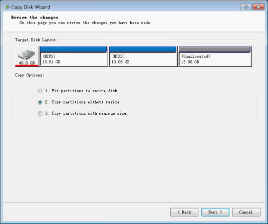 b. Here let's select "Copy partitions without resize". This way means backing up data as the original partition state, but the partitions are linked together after backing up.