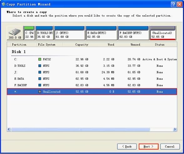 Select a unallocated space large enough to store driver backup, and then click "Next >".
