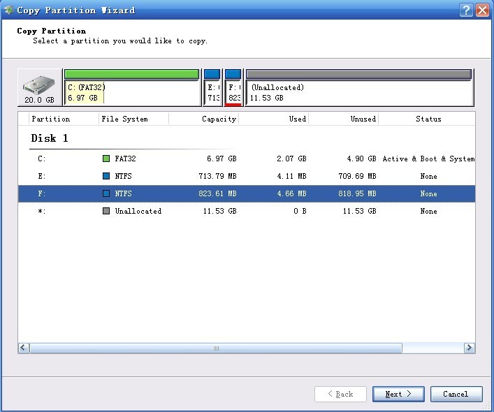 Choose partition F and click "Next":