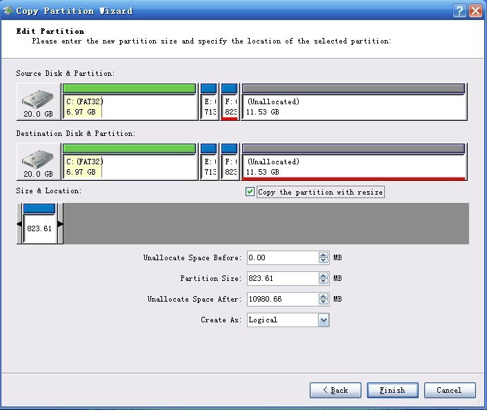 You can set partitions in this interface by click and drag or by imputing data. After it, click " Finish"
